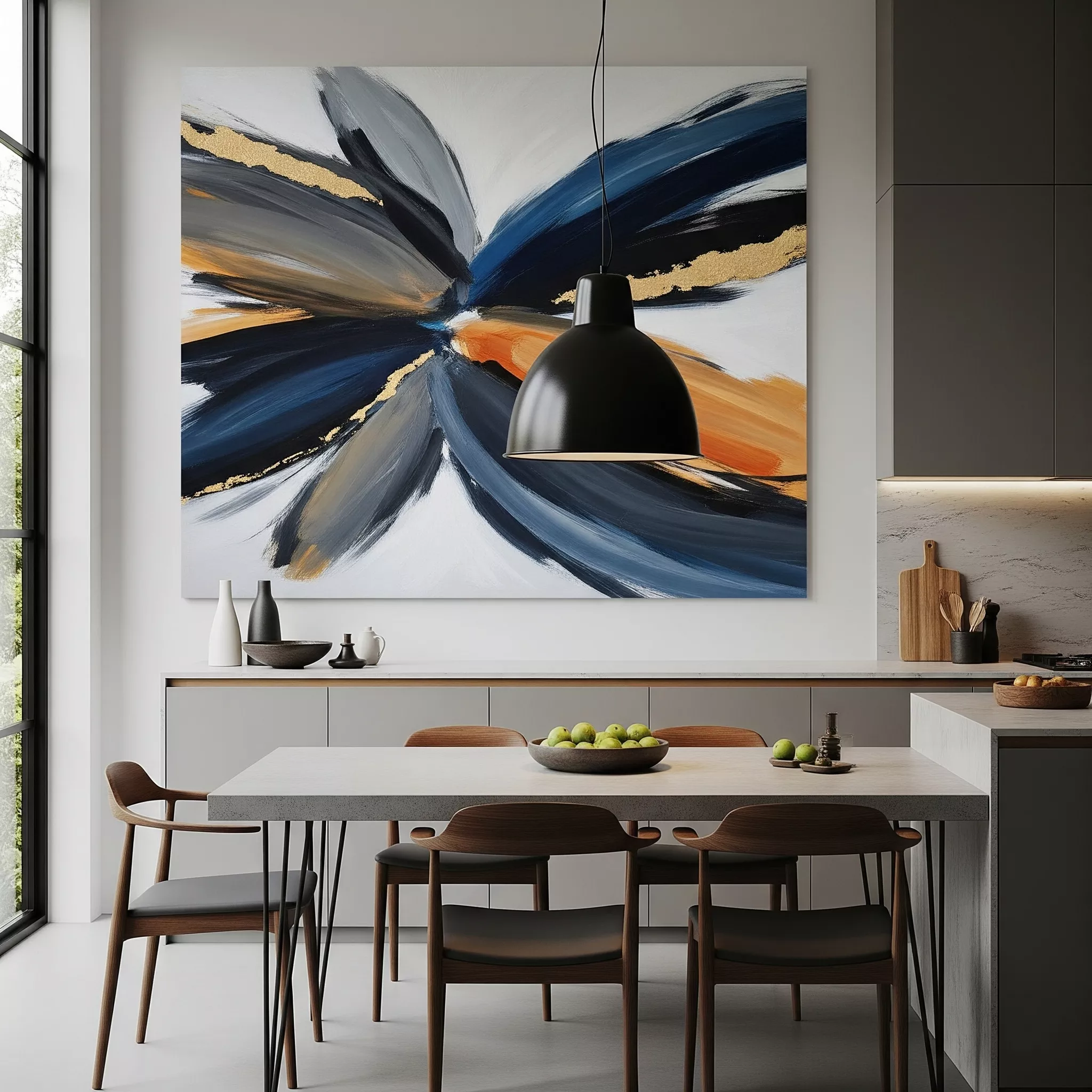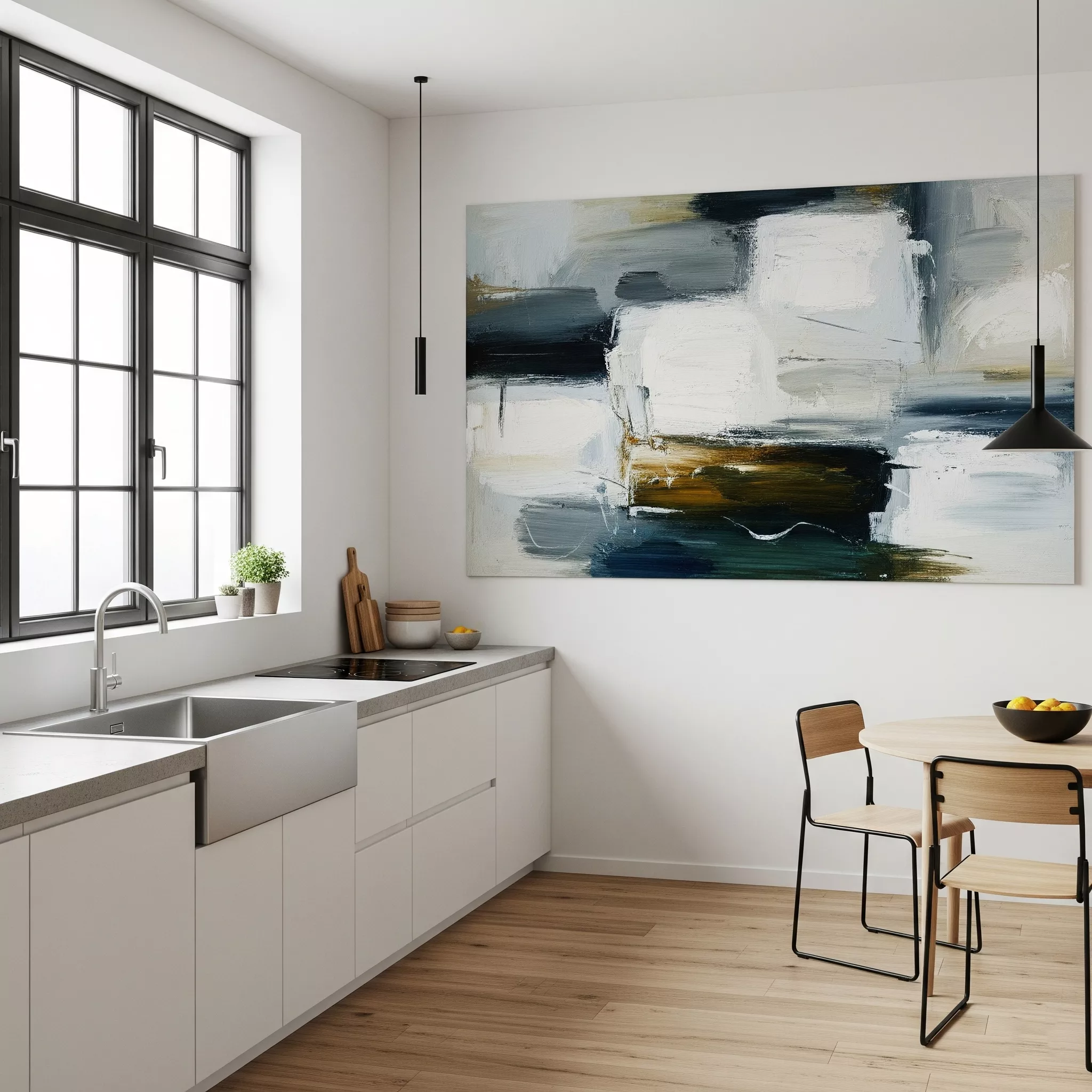Lukisan abstrak dapat memberikan sentuhan modern pada dapur Anda. Dengan warna-warna cerah dan bentuk yang unik, lukisan ini dapat menjadi titik fokus yang menarik perhatian. Pilihlah lukisan yang memiliki warna yang senada dengan palet warna dapur Anda untuk menciptakan harmoni.