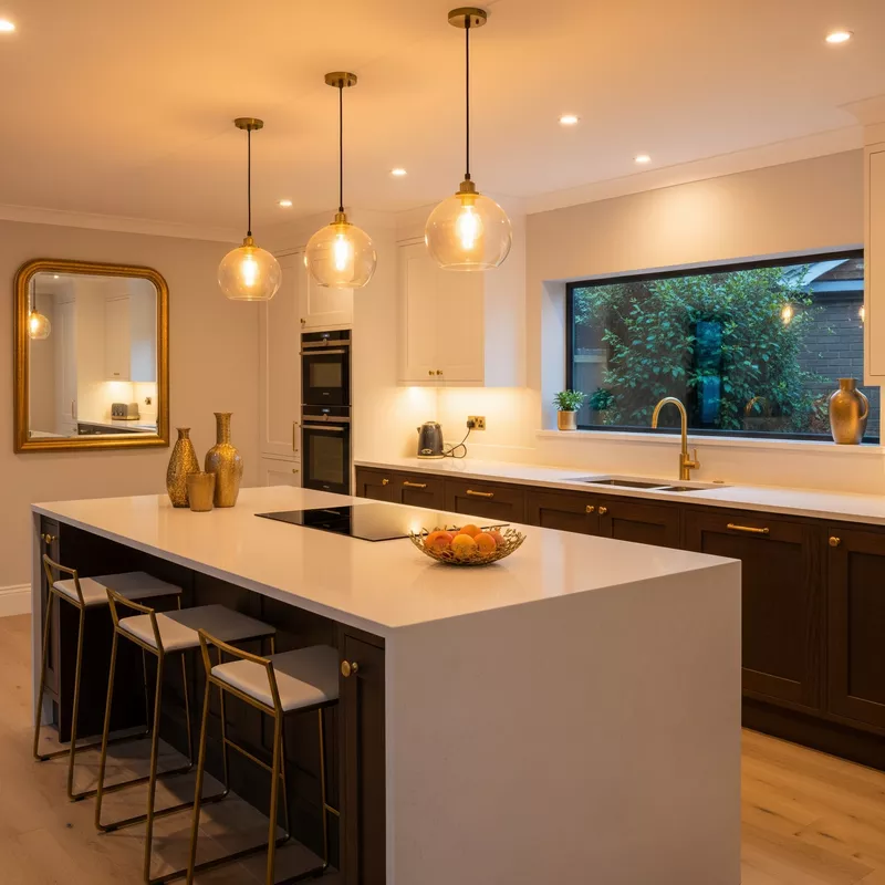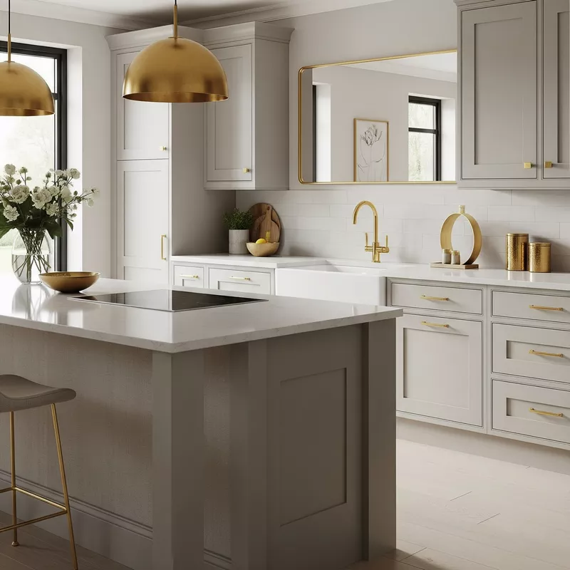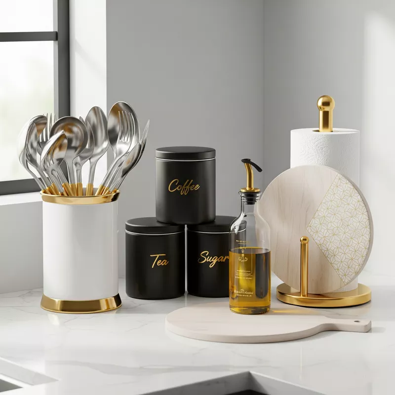 - Aksesoris: Gunakan aksesori seperti lampu gantung, bingkai foto, atau peralatan masak yang memiliki sentuhan emas.