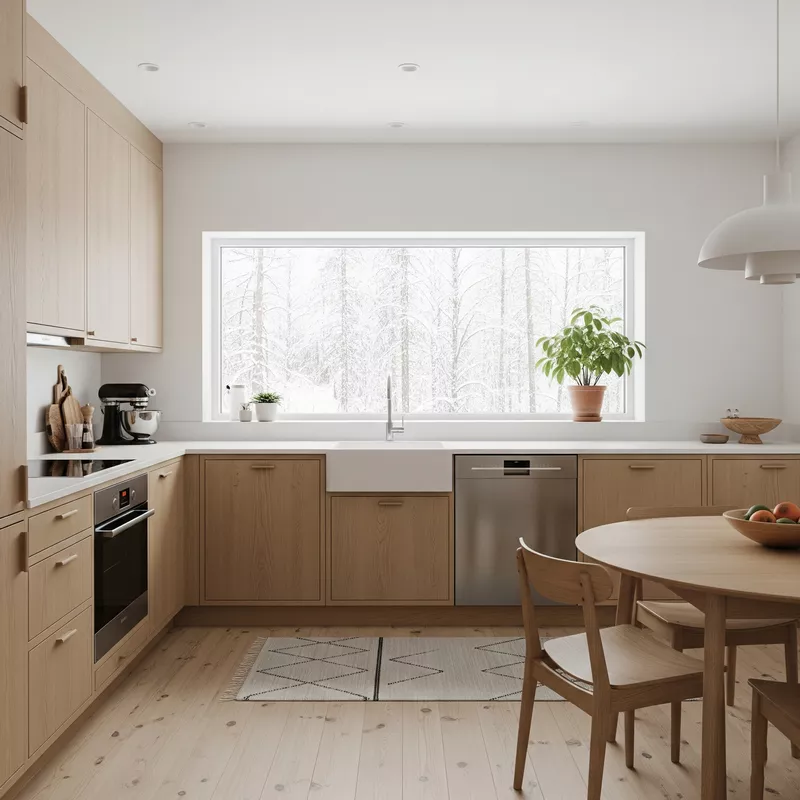 - Kayu: Kayu dengan finishing natural adalah elemen penting dalam dapur Skandinavia. Gunakan kayu untuk kitchen set, meja makan, atau lantai. Pilihlah jenis kayu ringan seperti pinus atau birch untuk kesan autentik.