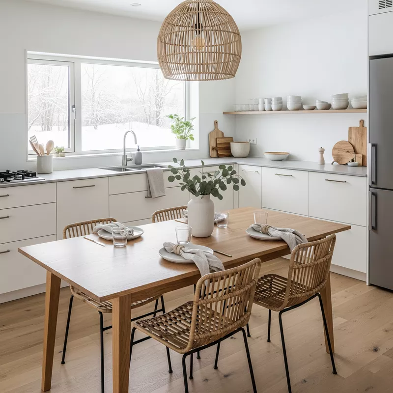 - Meja makan kayu: Meja makan kayu dengan desain minimalis akan melengkapi suasana Skandinavia. Pilih meja dengan kaki ramping dan bentuk sederhana.